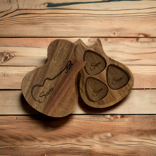 Engraved guitar pics and case with inscription.