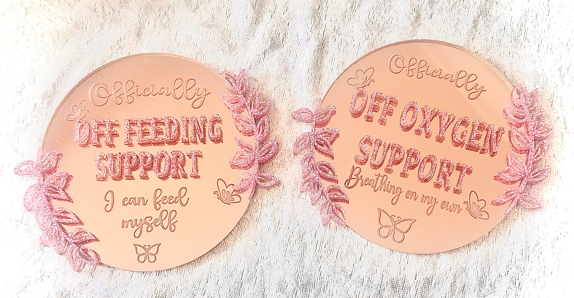 Capture and cherish every special moment in the NICU or SCN with our customisable milestone discs. From first smile to homecoming, let us help you celebrate your baby's progress with beautiful designs and personalised wording. Reduce your stress by letting me create your beautiful memories with our customised milestone discs, Just let me know what colours, wording (or just the milestone if you can’t think of what wording you like) and theme (If you want one) and I will design a few options to choose from. That simple!